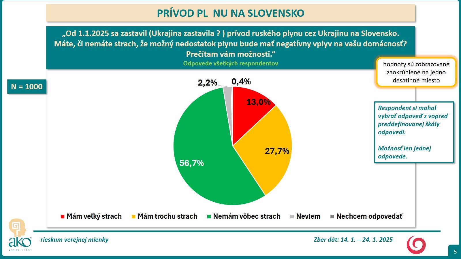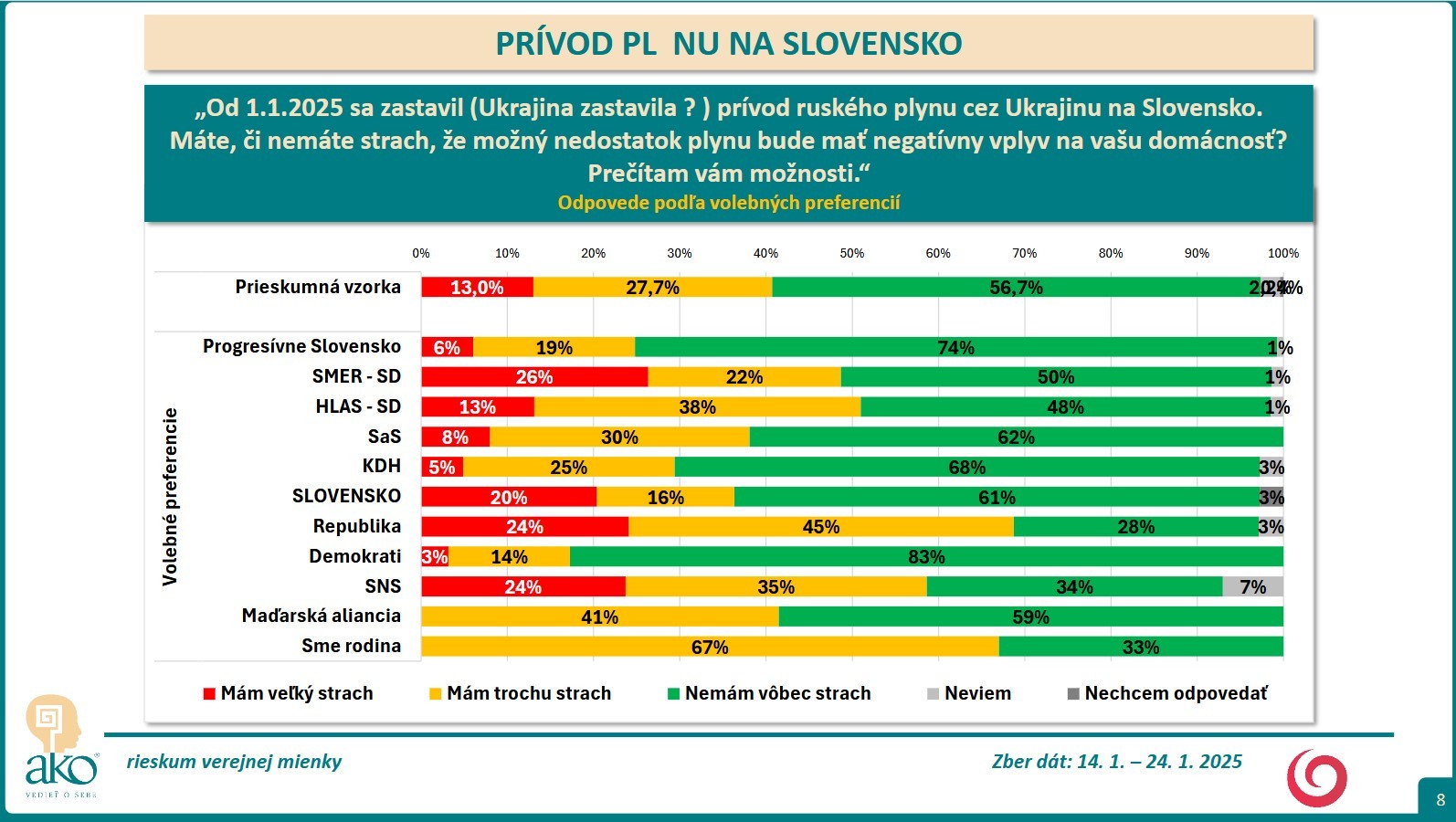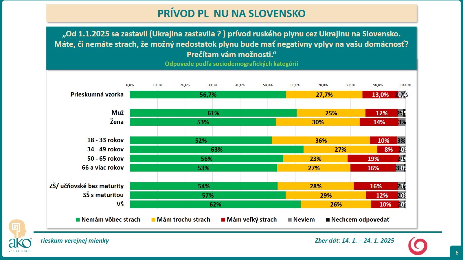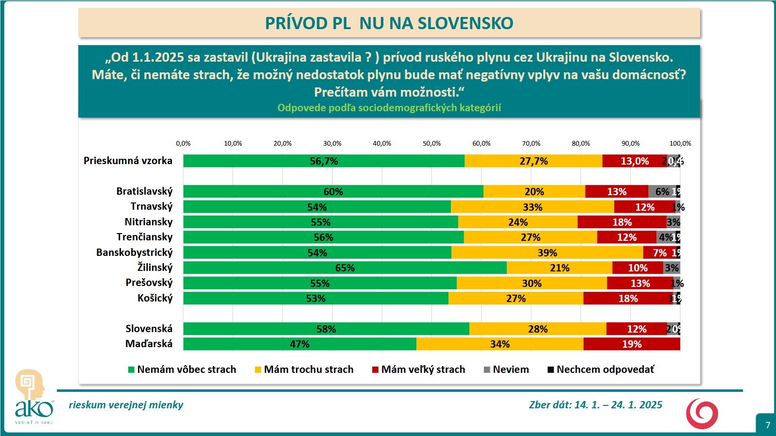 BRATISLAVA / Respondenti odpovedali na nasledujúcu otázku: Od 1.1.2025 sa zastavil prívod ruského plynu cez Ukrajinu na Slovensko. Máte, či nemáte strach, že možný nedostatok plynu bude mať negatívny vplyv na vašu domácnosť? Zber dát sa uskutočnil: 14. 1. – 24. 1. 2025.