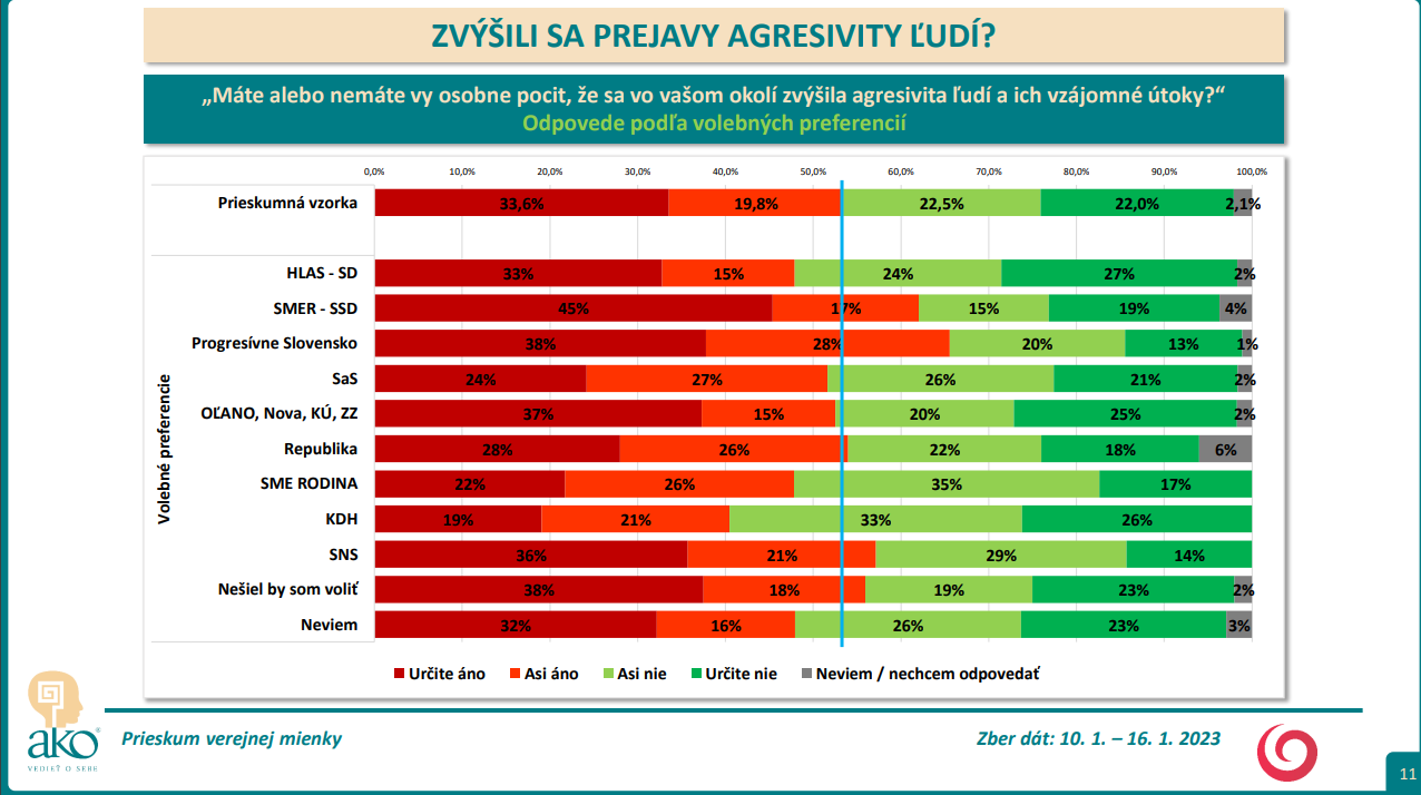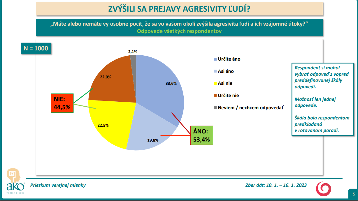 • Spolu až 53,4% opýtaných pozoruje zvýšenie agresivity a vzájomných útokov ľudí (33,6% určite áno, 19,8% asi áno).