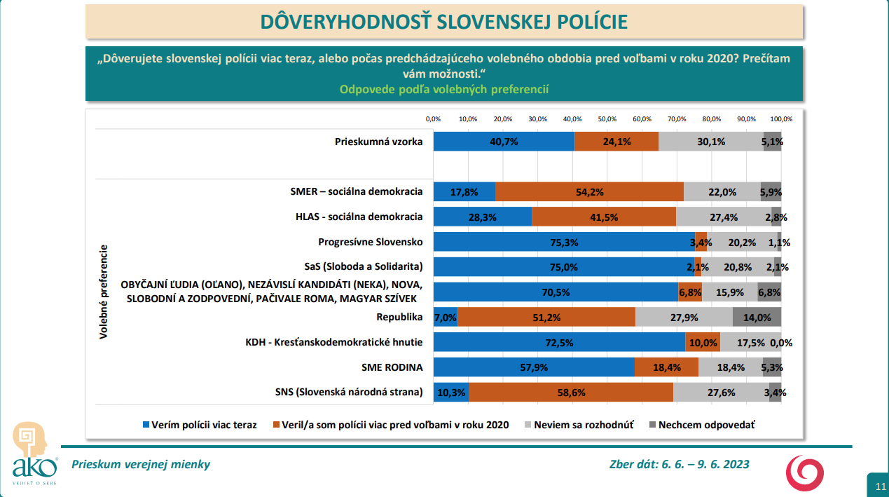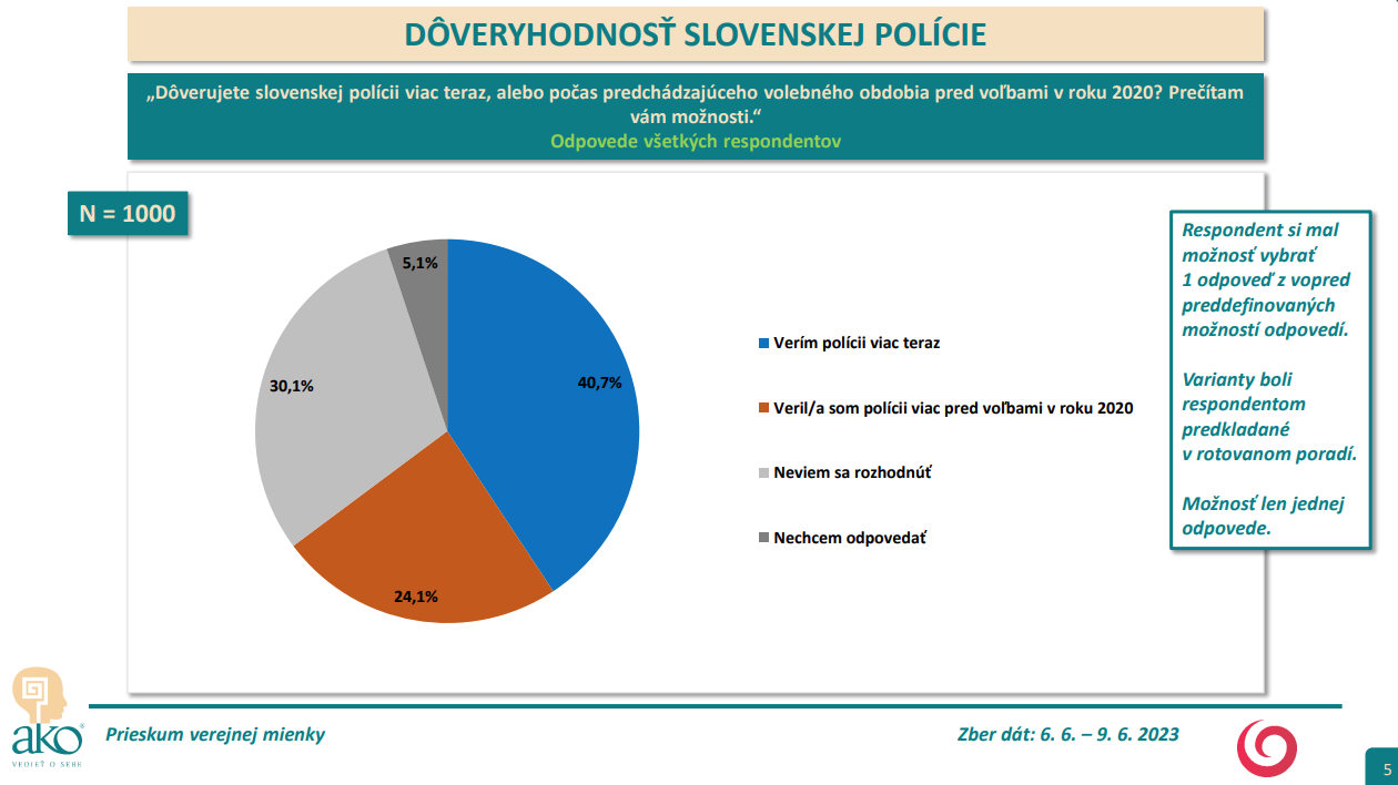BRATISLAVA / Respondenti mali uviesť, či dôverujú slovenskej polícii viac teraz alebo počas predchádzajúceho volebného obdobia pred voľbami v roku 2020. Z exkluzívneho prieskumu agentúry AKO pre reláciu Na hrane vyplýva, že v súčasnosti má vyššiu dôveru v políciu 40,7 percent opýtaných. Z výsledkov vyplýva, že sem patria skôr muži, vysokoškolsky vzdelaní ľudia, skôr mladší ľudia, obyvatelia Trnavského a Bratislavského kraja a voliči strán PS, SaS, KDH, OĽaNO, Sme rodina. Pred voľbami v roku 2020 malo vyššiu dôveru v políciu 24,1 % respondentov. Nadpriemerne často šlo o najstarších opýtaných, ľudí s najnižším vzdelaním, obyvateľov Trenčianskeho, Prešovského, Banskobystrického a Nitrianskeho kraja a voličov strán SNS, SMER-SSD, Republika, HLAS-SD. Až 30,1 % opýtaných sa nevedelo rozhodnúť a zvyšných 5,1 % respondentov nechcelo na otázku odpovedať.