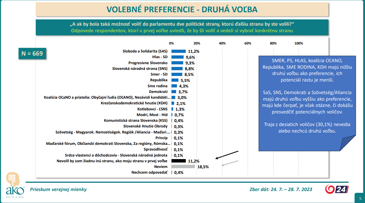• 18,5% opýtaných sa nevedelo rozhodnúť, ktorú stranu by volili ako svoju druhú voľbu,