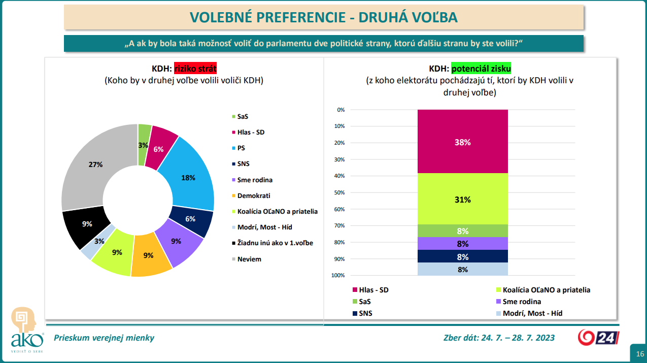 KDH by mohla získať najmä voličov HLAS-SD (38 % z tých, ktorí by volili KDH v druhej voľbe by volilo v prvej voľbe HLAS), 31%voličov koalície OĽANO. Menší podiel tvoria voliči SaS, Sme Rodina, SNS a Modrí, Most-Híd (po 8 %) (slide 16).