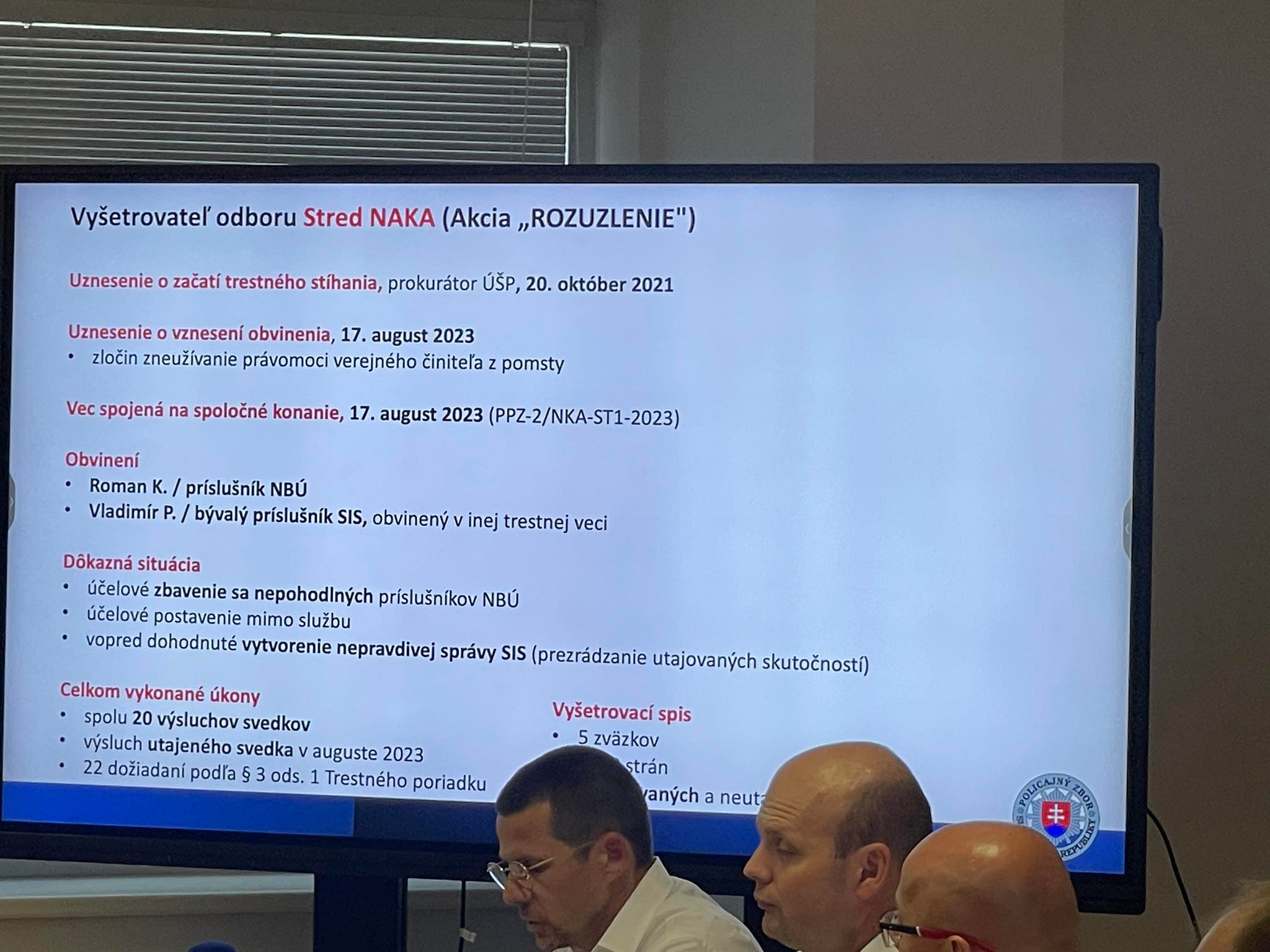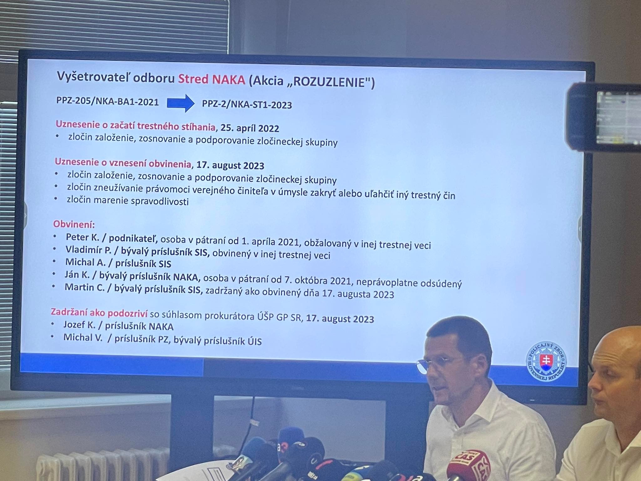 Policajný prezident uviedol, že obvinený je Vladimír Pčolinský (exšéf SIS) a rovnako aj Michal Aláč (šéf SIS), ale aj niekoľko vyšetrovateľov NAKA. Všetci sú obvinení zo založenia a podporovania zločineckej skupiny. Jej hlavou má byť Peter Košč. V niektorých prípadoch ide aj o marenie spravodlivosti. Obvinila aj riaditeľa NBÚ Romana Konečného.