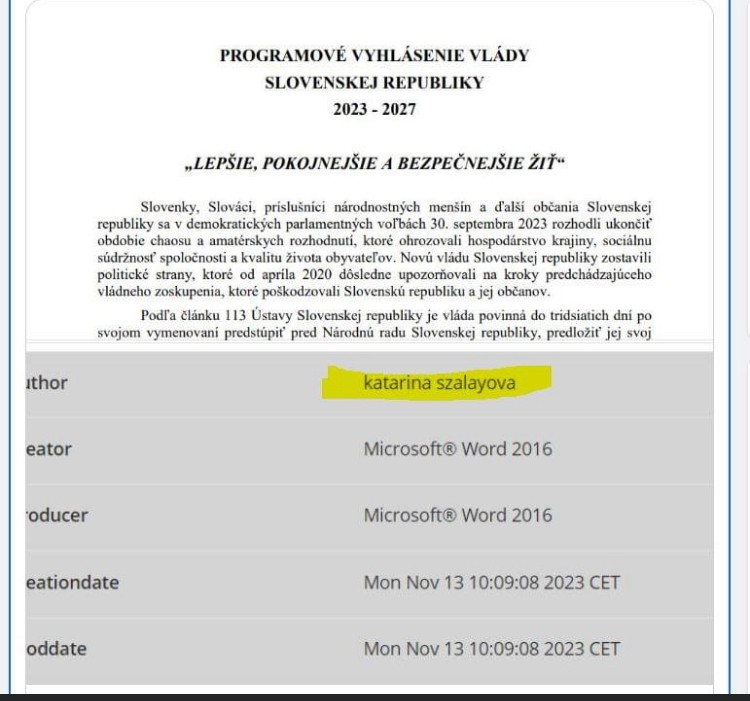 BRATISLAVA / Vo vlastnostiach dokumentu Programového vyhlásenia vlády, ktorý zverejnila Vláda SR na svojom webe, je ako autorka uvedená Katarína Szalayová. Bývalá čakateľka na prokuratúru je partnerkou premiéra Roberta Fica. Keď sa podobná vec stala v minulosti kancelárii Prezidentky SR, práve Fico nešetril kritikou. Nejde pritom o prvý takýto "prešľap".