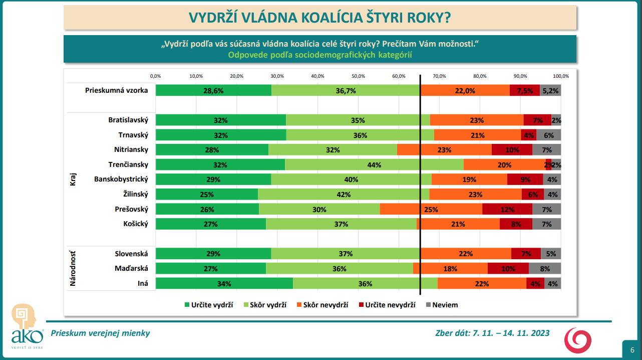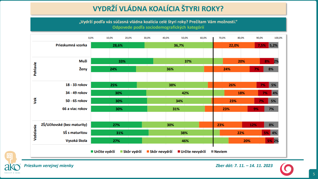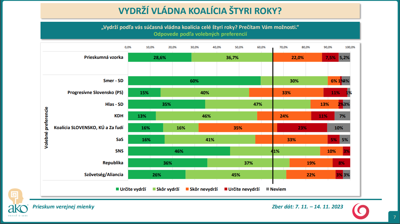 Naopak, spolu 29,5 % opýtaných si myslí, že súčasná vládna koalícia nevydrží celé štyri roky: