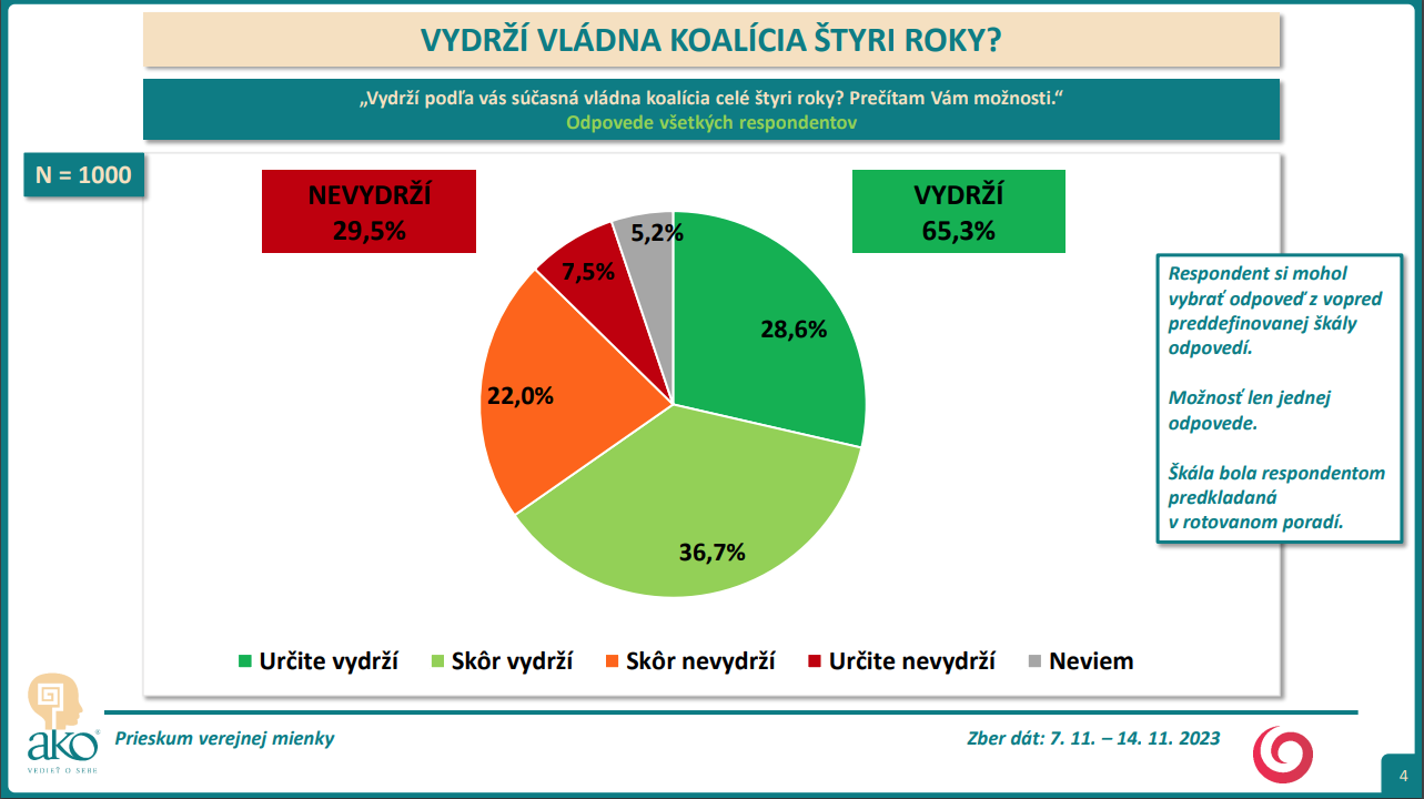 BRATISLAVA / Respondenti mali uviesť, či podľa nich vydrží súčasná vládna koalícia celé štyri roky. Z exkluzívneho prieskumu agentúry AKO pre reláciu Na hrane vyplýva, že väčšina opýtaných (65,3 %) si myslí, že súčasná vládna koalícia vydrží celé štyri roky. To, že nevydrží si myslí 29,5 % respondentov.