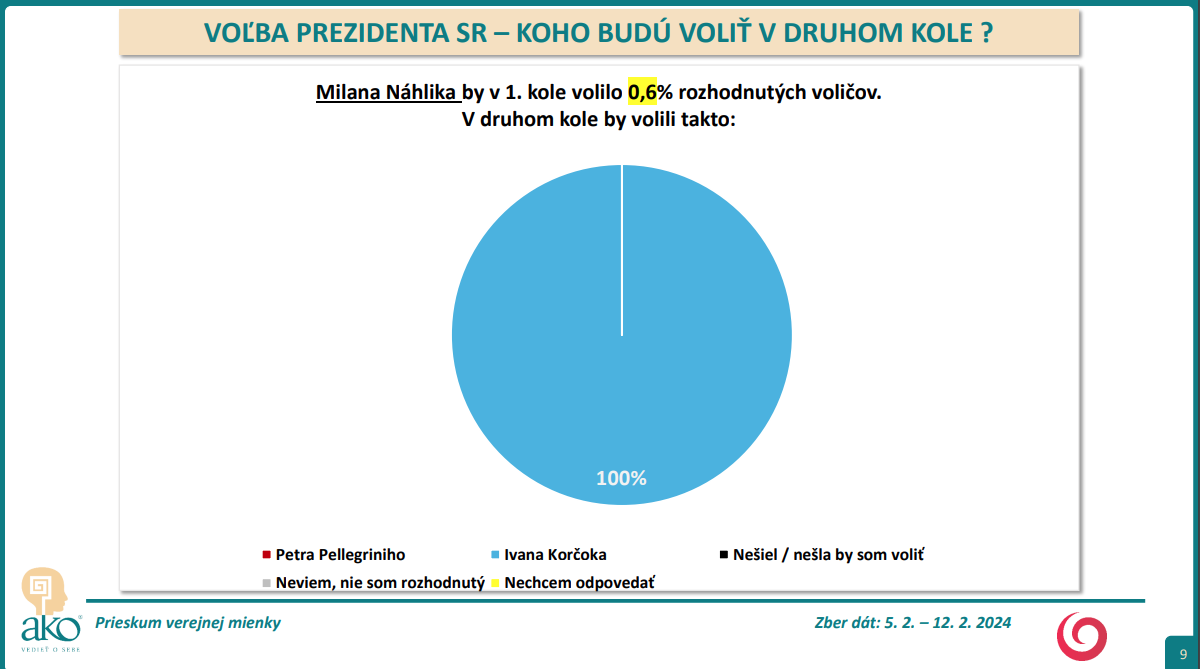 Milan Náhlik by podľa prieskumu v prvom kole získal 0,6 % hlasov. V druhom kole by všetky jeho hlasy získal Ivan Korčok (100 %).