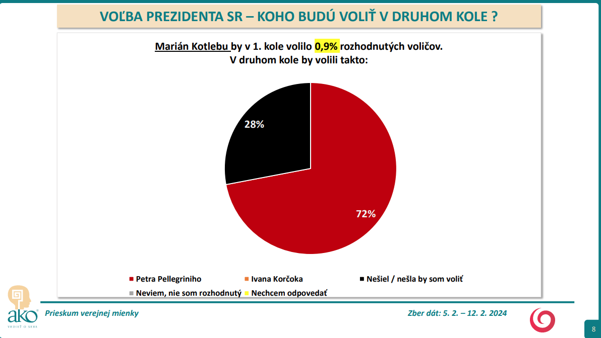 Marián Kotleba by podľa prieskumu v prvom kole získal 0,9 % hlasov. V druhom kole by až 72 % jeho voličov dalo hlas Petrovi Pellegrinimu. Ivan Korčok by v tomto prípade získal 28 % z jeho hlasov.