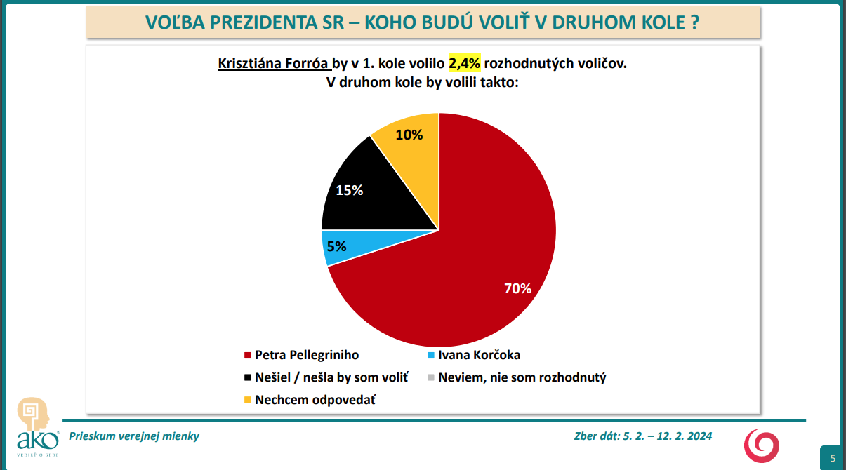 Krisztián Forró by podľa prieskumu v prvom kole získal 2,4 % hlasov. V druhom kole by až 70 % jeho voličov dalo hlas Petrovi Pellegrinimu. Ivan Korčok by v tomto prípade získal len 5 % hlasov. 15 % respondentov by voliť nešlo a 10 % nechcelo odpovedať.