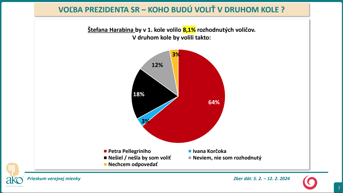 Štefan Harabin by podľa prieskumu v prvom kole získal 8,1 % hlasov. V druhom kole by jeho voliči prevažne volili Petra Pellegriniho (64 %). Ivan Korčok by získal len 3 % jeho voličov. 18 % respondentov by voliť nešlo, 12 % by nebolo rozhodnutých a 3 % nechcelo odpovedať.