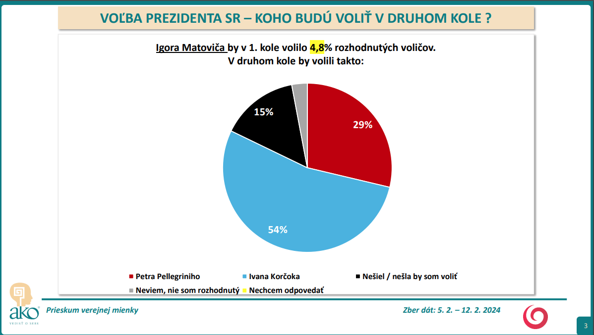 Igor Matovič by podľa prieskumu v prvom kole získal 4,8 % hlasov. V druhom kole by prevažná väčšina jeho voličov dala svoj hlas Ivanovi Korčokovi (54 %). Petra Pellegriniho by volilo 29 % respondentov. 15 % respondentov by voliť nešlo a 2 % by nevedeli, komu dajú svoj hlas.