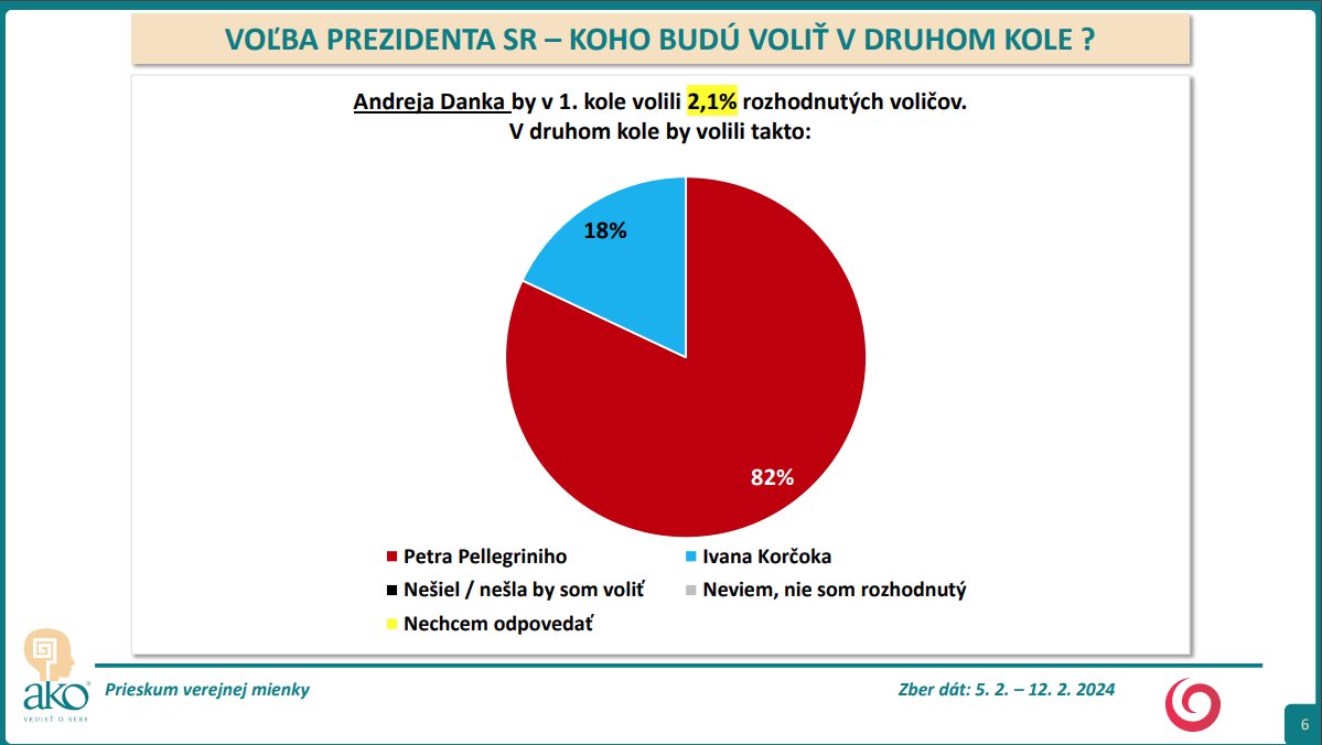Andrej Danko by podľa prieskumu v prvom kole získal 2,1 % hlasov. V druhom kole by 82 % jeho voličov volili Petra Pellegriniho. Ivan Korčok by získal 18 % hlasov.