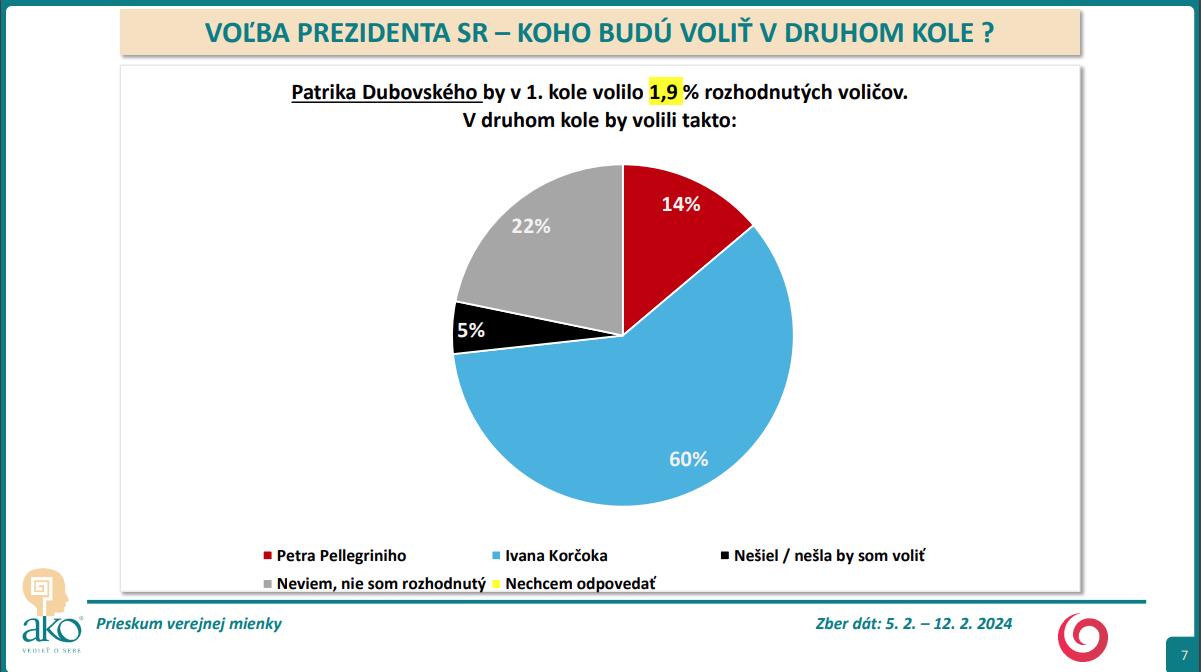 Patrik Dubovský by podľa prieskumu v prvom kole získal 1,9 % hlasov. V druhom kole by prevažnú väčšinu jeho hlasov získal Ivan Korčok (60 %). Peter Pellegrini by získal len 14 % hlasov. 22 % voličov nie je rozhodnutých a 5 % by voliť nešlo.