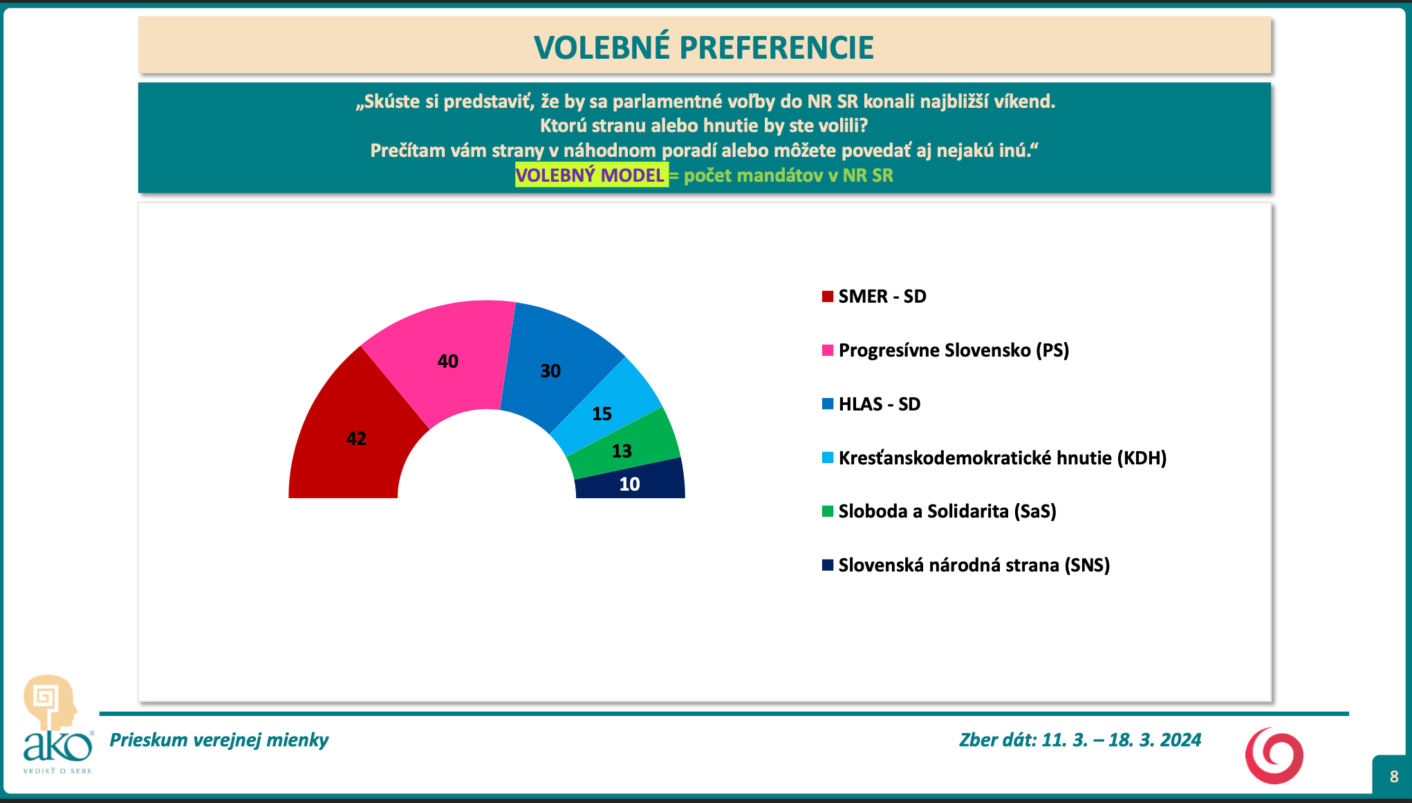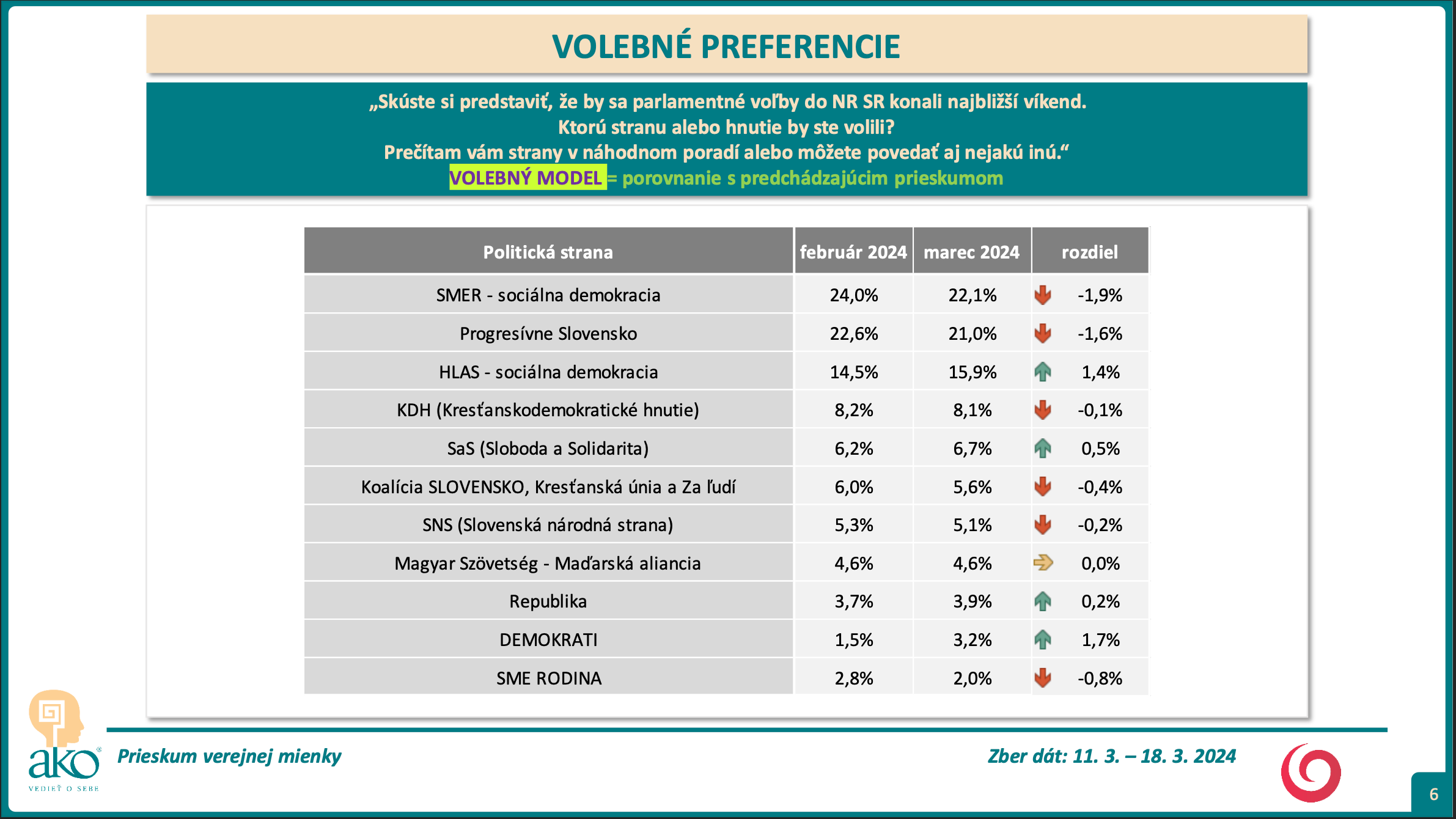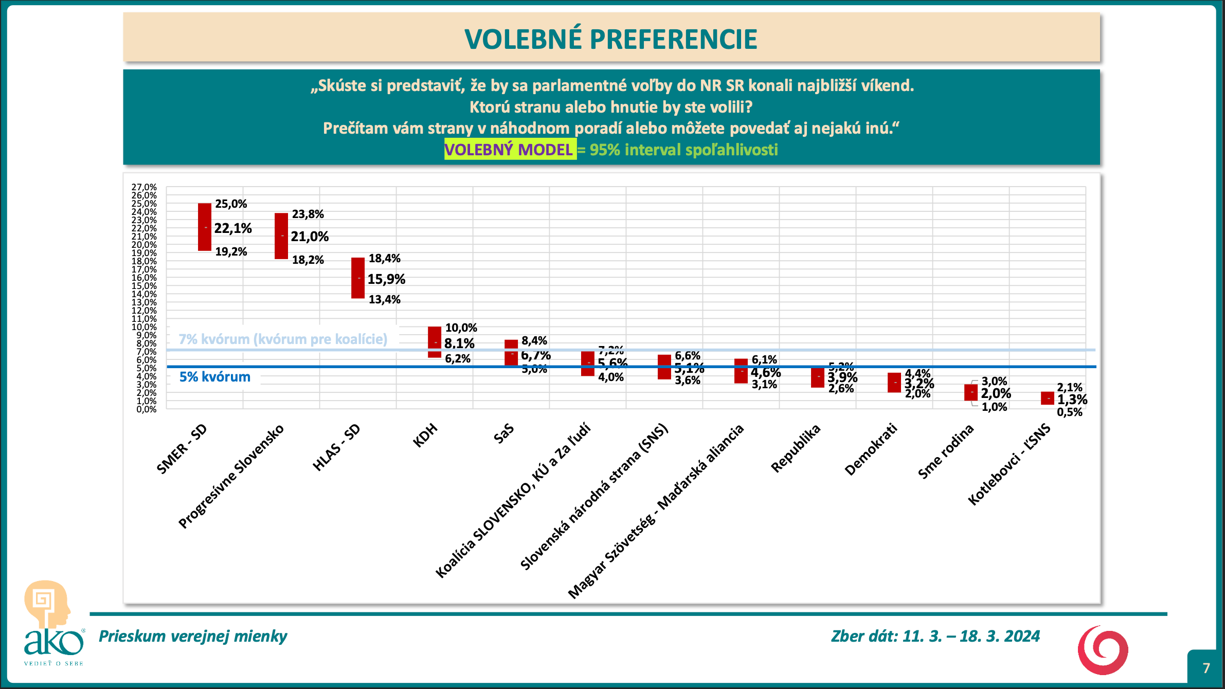 BRATISLAVA / Parlamentné voľby by podľa exkluzívneho prieskumu AKO pre JOJ 24 najbližší víkend vyhrala strana Smer – sociálna demokracia (Smer-SD) so ziskom 22,1 % hlasov opýtaných. Na druhom mieste by skončilo Progresívne Slovensko so ziskom 21,0 % hlasov. Tretie miesto by s výrazným skokom obsadil Hlas-SD, ktorý by volilo 15,9 % respondentov. Koalícia SLOVENSKO by zostala pred bránami parlamentu. Do parlamentu by sa nedostala Maďarská aliancia, Republika, Sme rodina ani Demokrati.