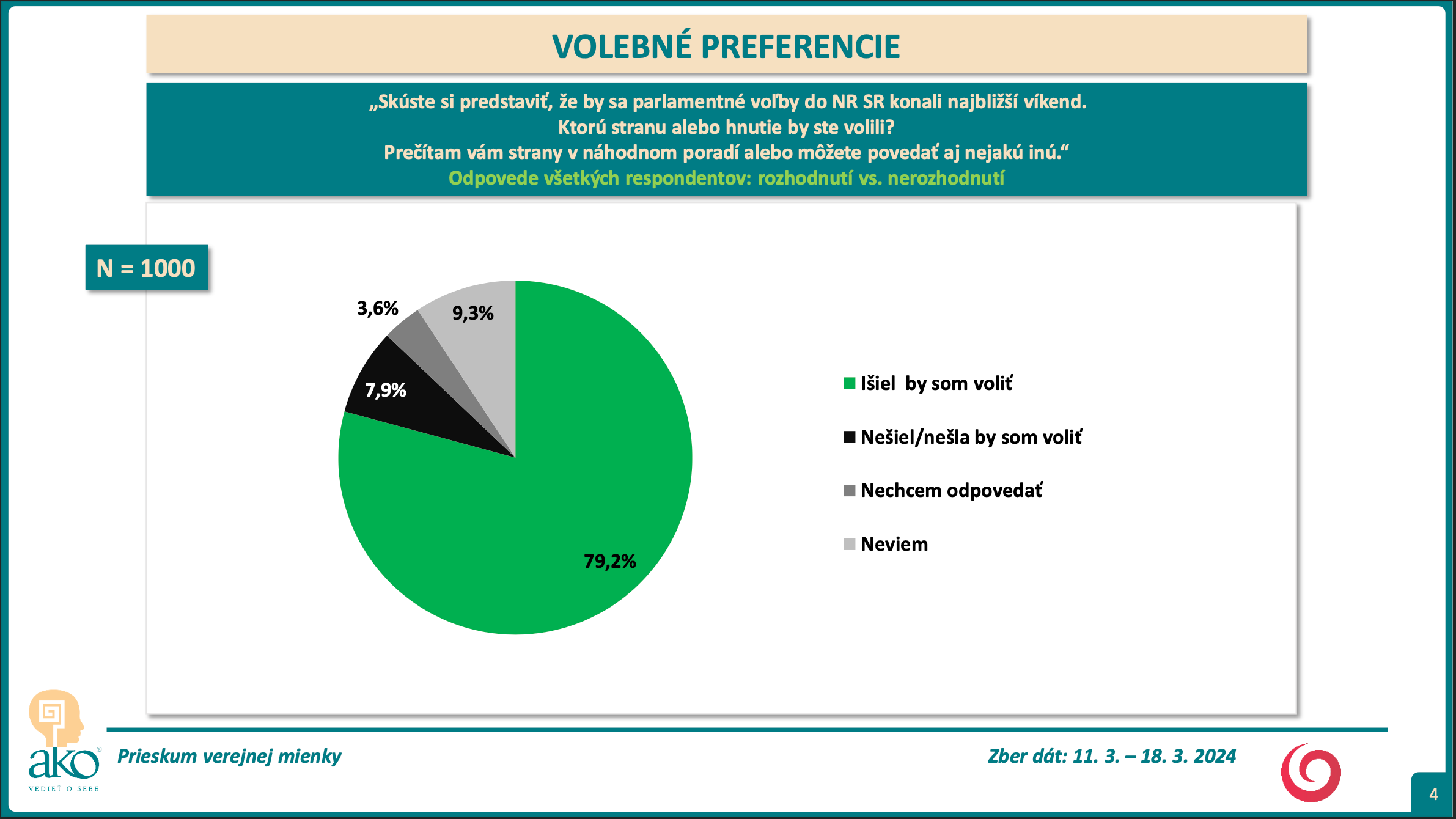 Agentúra AKO robila telefonický prieskum na vzorke tisíc ľudí starších ako 18 rokov v dňoch 11. – 18. marca 2024. Respondenti neboli oboznámení s tým, kto je zadávateľ prieskumu.